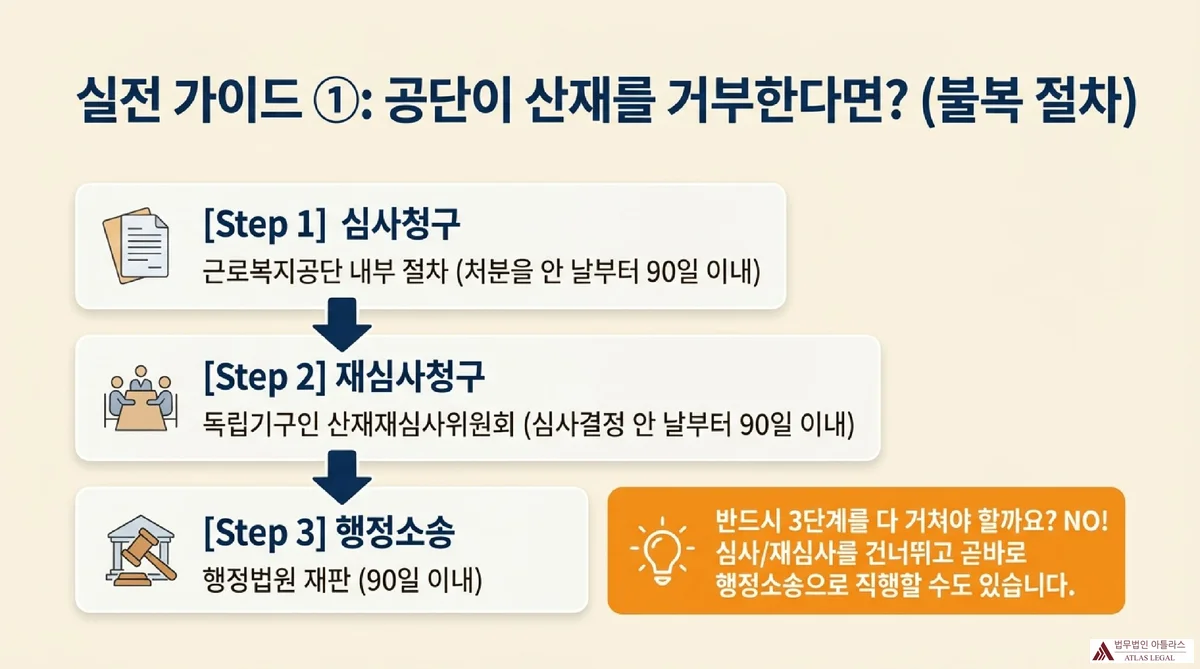 | 심사청구 (임의) | 근로복지공단 | 처분을 안 날로부터 90일 이내 | 공단 내부 불복 절차. 산재보험법 제103조. 거치지 않고 바로 행정소송 제기 가능 |