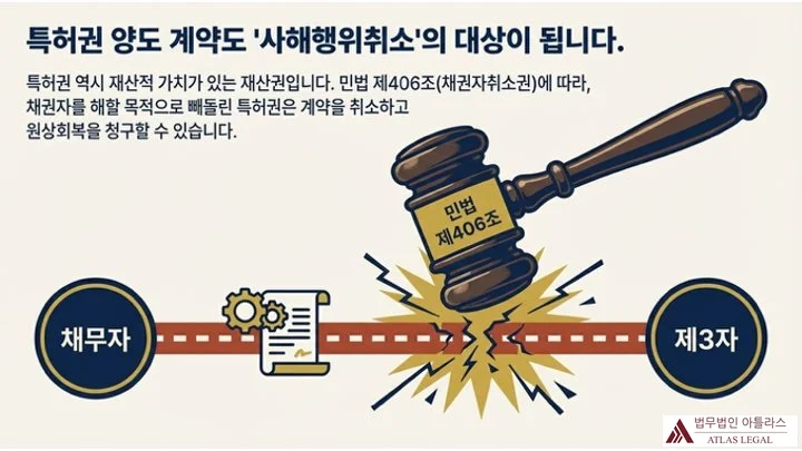 특허권 역시 재산적 가치가 있는 재산권으로, 민법 제406조 채권자취소권의 대상이 됩니다.