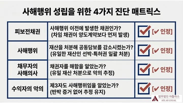 사해행위 성립을 위한 4가지 진단 매트릭스 표: 피보전채권, 사해행위, 채무자의 사해의사, 수익자의 악의 모두 인정 체크 표시