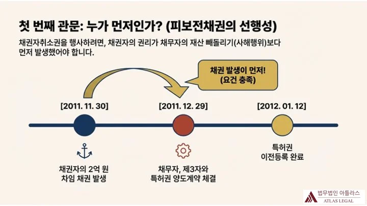 채권자취소권을 행사하려면 우선 피보전채권이 존재해야 합니다. 원칙적으로 피보전채권은 사해행위 이전에 발생한 채권이어야 합니다. 이 사건에서 채권자의 차임 채권은 2011. 11. 30.경 발생한 반면, 특허권 양도계약은 그 이후인 2011. 12. 29.에 체결되었으므로 피보전채권의 요건을 충족하였습니다.
