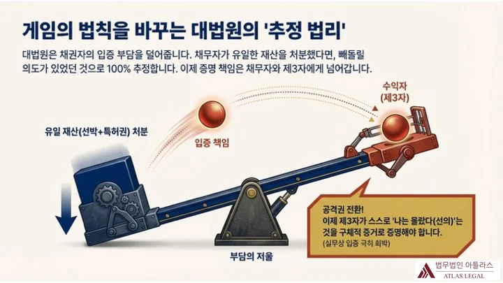 유일 재산 처분 시 입증 책임이 채무자·수익자 쪽으로 넘어가는 저울 그림, 대법원 추정 법리로 공격권이 전환됨을 설명