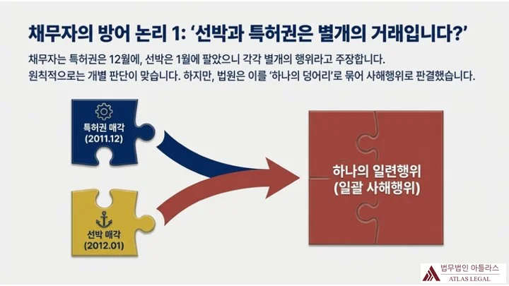 법원은 특허권과 선박 매각을 별개가 아닌 하나의 일련행위로 묶어 사해행위를 인정했습니다.