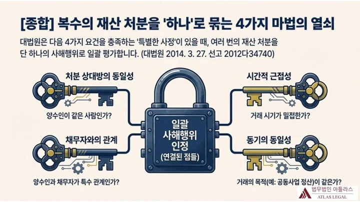 자물쇠에 4개의 열쇠(처분 상대방의 동일성, 시간적 근접성, 채무자와의 관계, 동기의 동일성)가 꽂혀 일괄 사해행위 인정 조건을 시각화