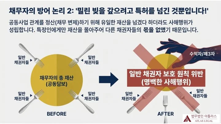 채무자 측에서는 “기존 공동사업 관계를 정산하는 과정에서 특허권을 이전한 것이므로 사해행위가 아니다”라는 항변을 자주 합니다. 이 주장이 법적으로 받아들여질 수 있는지가 실무에서 자주 쟁점이 됩니다.