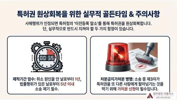 특허권 원상회복을 위한 제척기간(취소 원인을 안 날로부터 1년, 법률행위일로부터 5년)과 처분금지가처분 병행 신청의 중요성을 타이머·경고등 이미지로 설명
