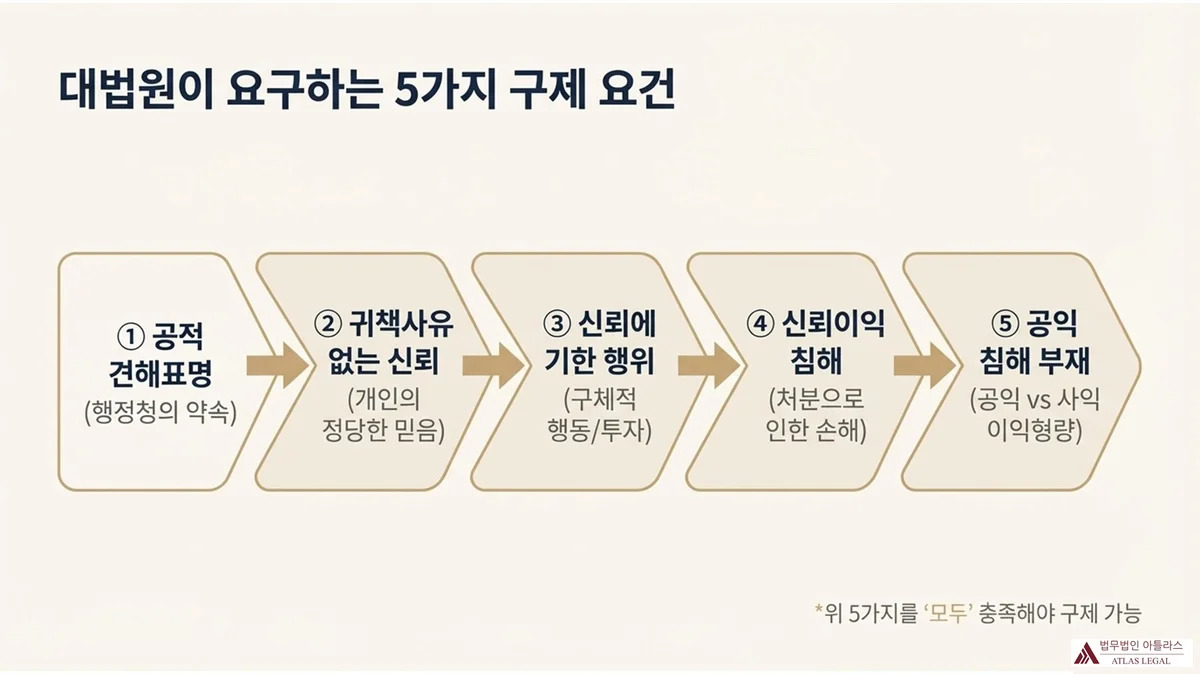 이 상황에서 당사자가 담당 공무원의 답변을 녹취까지 보관하고 있다고 가정해 봅시다. 그러나 행정청은 “담당자 개인의 의견일 뿐 공식 답변이 아니었다”며 처분을 강행합니다. 이 사안의 핵심은 해당 공무원의 언동이 법적으로 ‘공적 견해표명’에 해당하는지 여부입니다. 대법원은 이처럼 행정조직의 형식적 권한분장보다 실질을 기준으로 판단해야 한다고 일관되게 설시하고 있습니다. 신뢰보호원칙의 5가지 요건을 정확히 이해하면, 이러한 상황에서 구제 가능성을 현실적으로 검토할 수 있습니다.