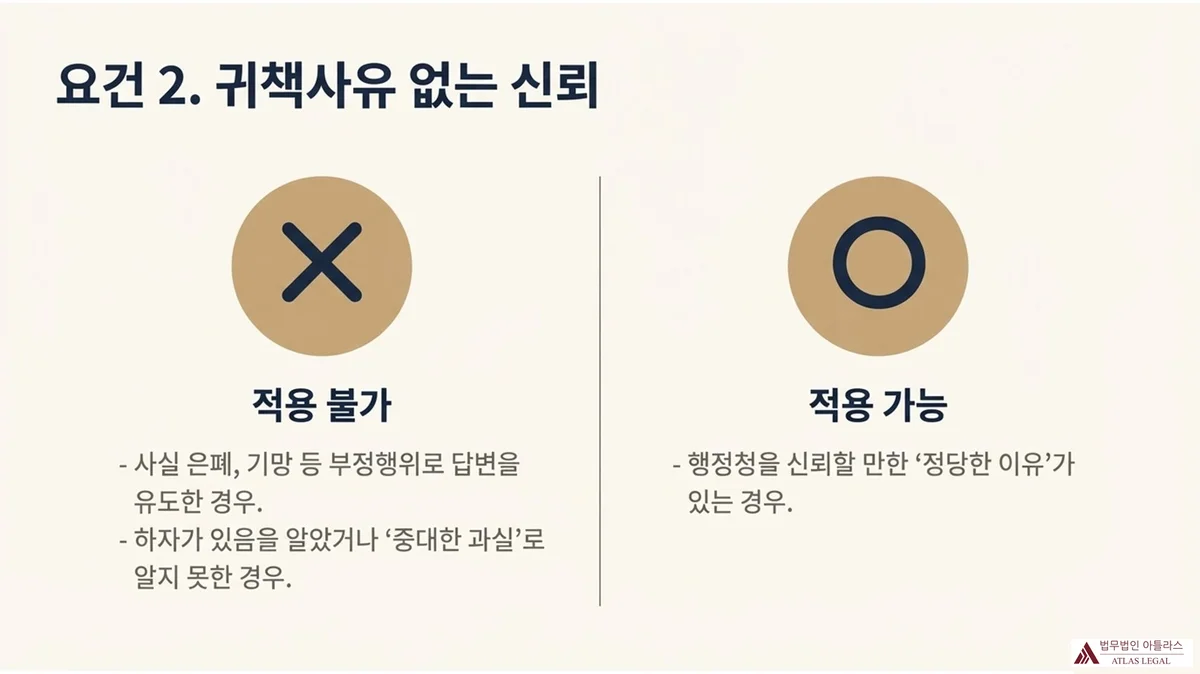 즉, 개인에게 귀책사유가 인정되는 경우는 크게 두 가지입니다. 첫째, 사실 은폐·기망행위·허위신청 등 부정한 방법으로 행정청의 견해표명을 이끌어낸 경우입니다. 둘째, 부정행위는 아니더라도 견해표명에 하자가 있다는 것을 알았거나 중대한 과실로 알지 못한 경우입니다. 반대로 개인이 행정청을 신뢰할 만한 정당한 이유가 있고 그에 따라 행동했다면, 원칙적으로 귀책사유가 없다고 볼 수 있습니다.