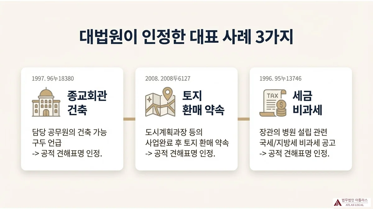 대법원 1997. 9. 12. 선고 96누18380 판결 — 도시계획구역 내 토지에 종교회관 건축을 위한 토지형질변경허가 과정에서, 담당 공무원이 관련 법규상 건축이 가능하다고 언급한 사안. 대법원은 토지형질변경이 가능할 것이라는 공적 견해표명이 있었다고 판단하였습니다.