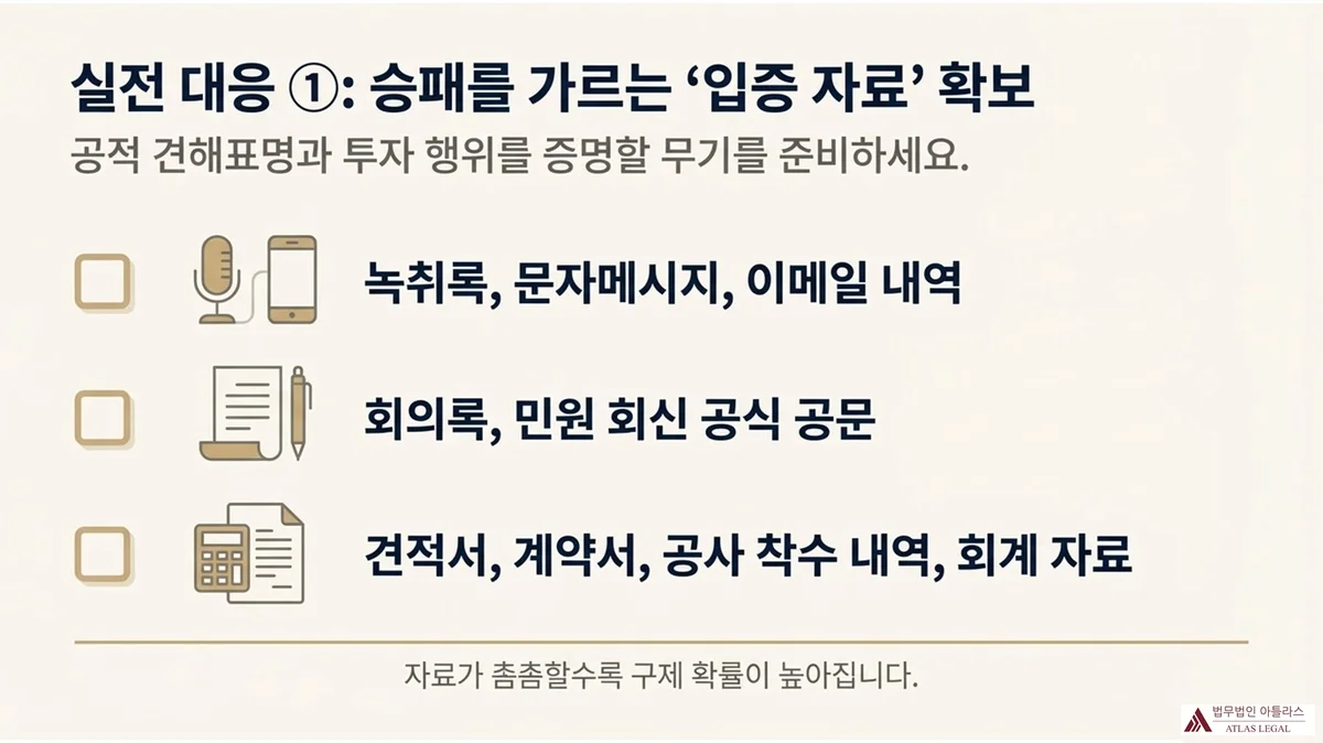 실무에서 가장 중요한 것은 ‘공적 견해표명’의 존재를 입증하는 것입니다. 녹취록, 문자메시지, 이메일, 회의록, 민원 회신 공문 등을 최대한 확보해야 합니다. 또한 그 견해표명을 신뢰하여 구체적인 행위(투자, 계약 등)를 했다는 점을 뒷받침하는 자료—견적서, 계약서, 공사 착수 내역, 회계 자료 등—도 함께 준비해야 합니다.