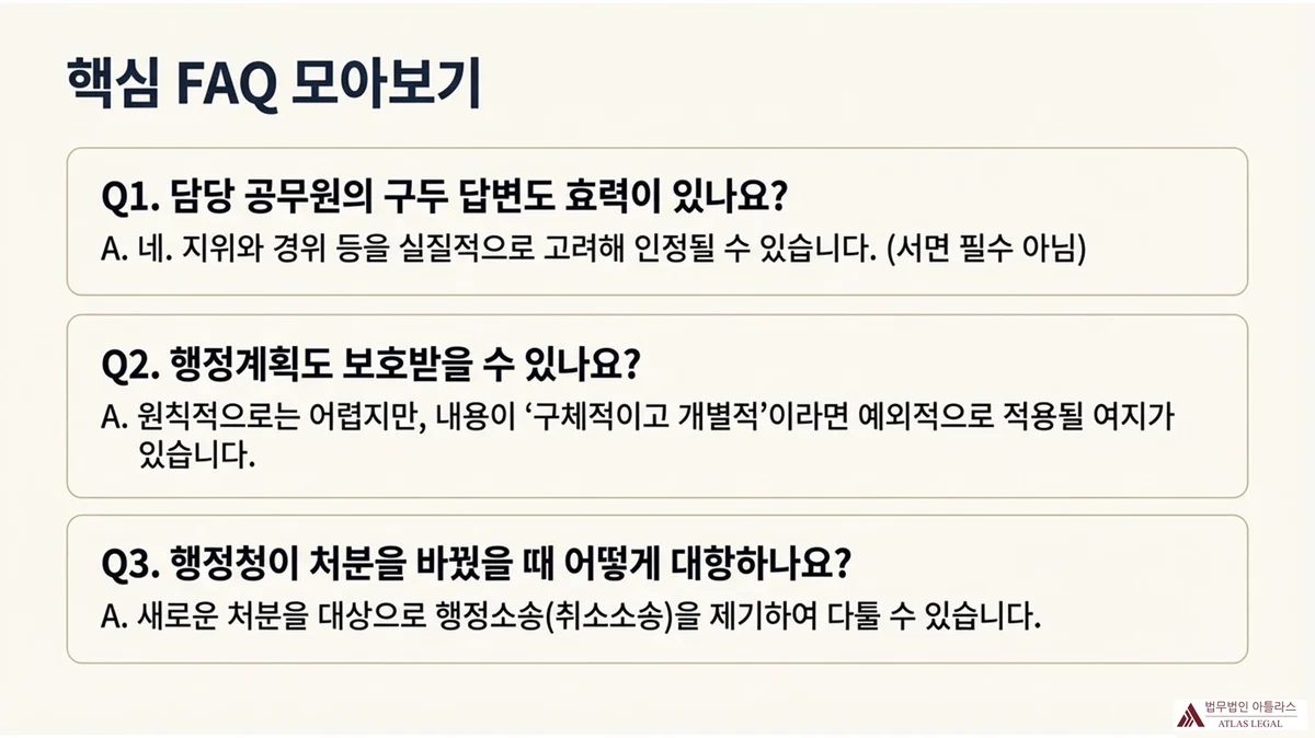 반면 단순한 민원 안내, 추상적 의견 제시, 법령과 절차에 근거하지 않은 담당자의 비공식 언동 등은 공적 견해표명으로 인정받기 어렵습니다.