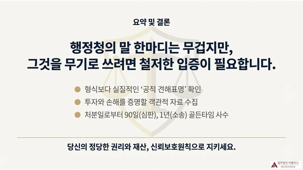 행정처분에 대한 불복 사건을 다수 처리한 경험을 바탕으로, 신뢰보호원칙 적용 가능성은 사실관계에 따라 크게 달라진다는 점을 강조드립니다. 공적 견해표명의 존재를 입증할 자료가 있는지, 귀책사유 문제가 없는지, 그리고 실제로 어떤 손해가 발생했는지를 구체적으로 검토해야 합니다. 법무법인 아틀라스는 기업 및 개인 의뢰인의 행정분쟁 사건에서 이러한 요건 분석을 실무적으로 수행하고 있습니다.