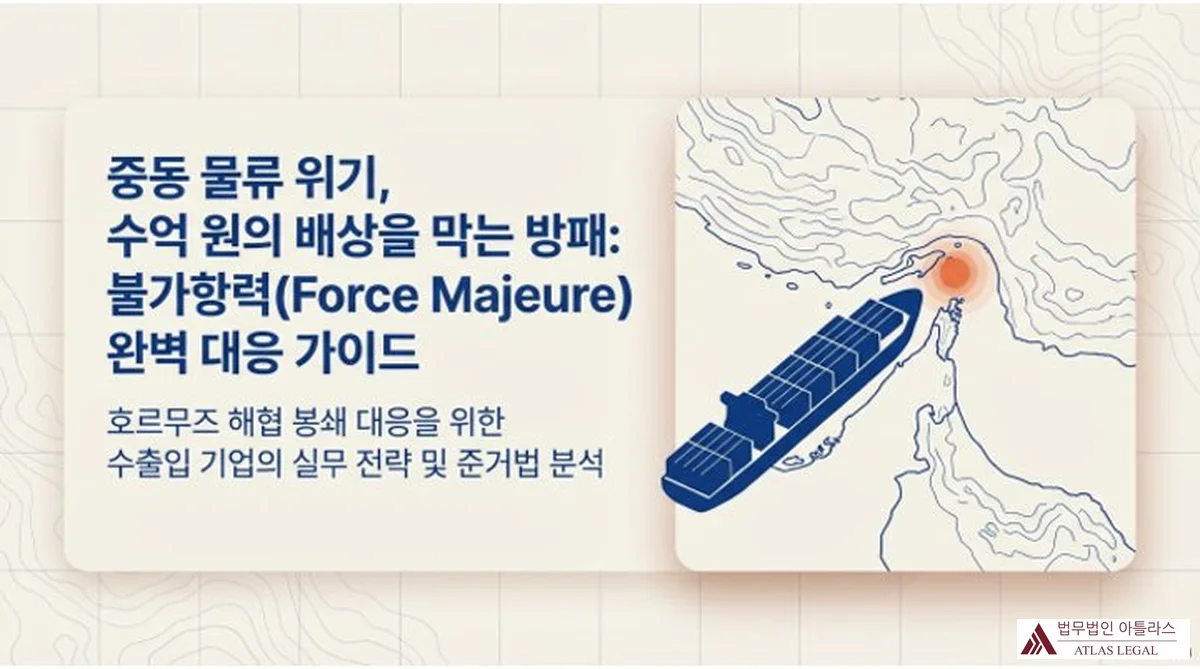 호르무즈 해협을 항행하는 컨테이너선과 봉쇄 상황을 지도 위에 표현한 일러스트. 좌측에는 '중동 물류 위기, 수억 원의 배상을 막는 방패: 불가항력(Force Majeure) 완벽 대응 가이드' 제목이 있고, 하단에 호르무즈 해협 봉쇄 대응을 위한 수출입 기업의 실무 전략 및 준거법 분석이라는 부제가 표시됨