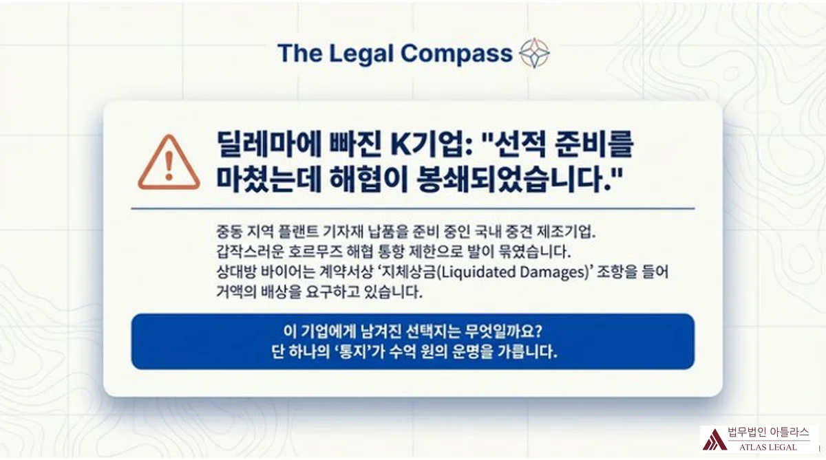 가상 사례: 중동 지역에 플랜트 기자재를 납품하기로 한 국내 중견 제조기업. 선적 준비를 마친 뒤 호르무즈 해협 통항이 제한됐다는 소식을 접했습니다. 상대방 바이어는 계약서상 지체상금 조항을 들어 배상을 요구하고 있습니다. 이 기업에게 남겨진 선택지는 무엇일까요?