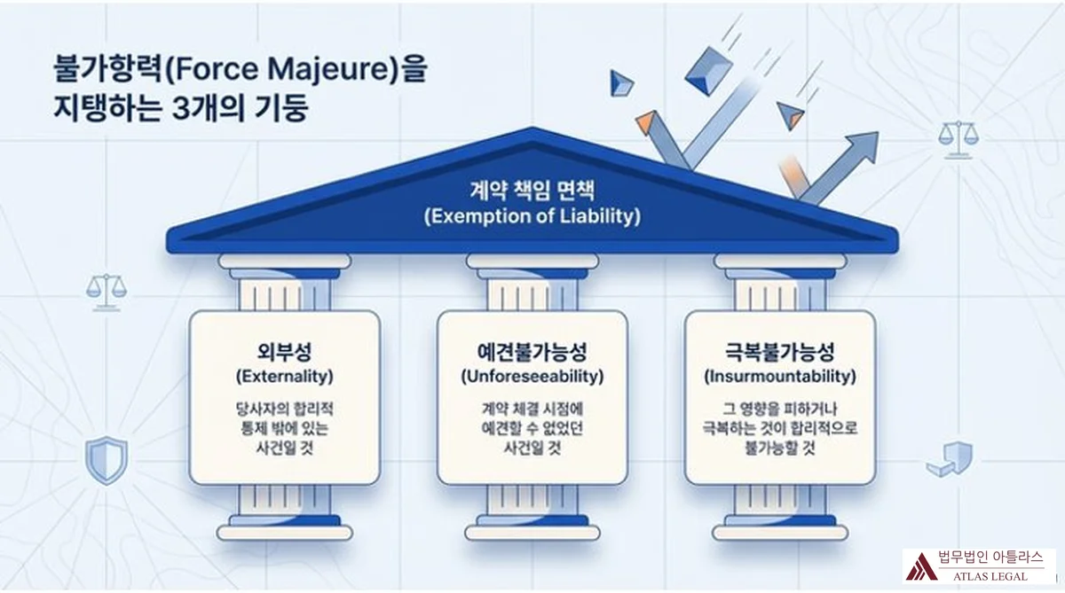 불가항력(Force Majeure)을 지탱하는 3개의 기둥을 신전 건축물로 표현한 인포그래픽. 지붕에 계약 책임 면책(Exemption of Liability)이 적히고, 세 기둥에 각각 외부성(Externality, 당사자의 합리적 통제 밖에 있는 사건), 예견불가능성(Unforeseeability, 계약 체결 시점에 예견할 수 없었던 사건), 극복불가능성(Insurmountability, 그 영향을 피하거나 극복하는 것이 합리적으로 불가능한 것)이 설명됨
