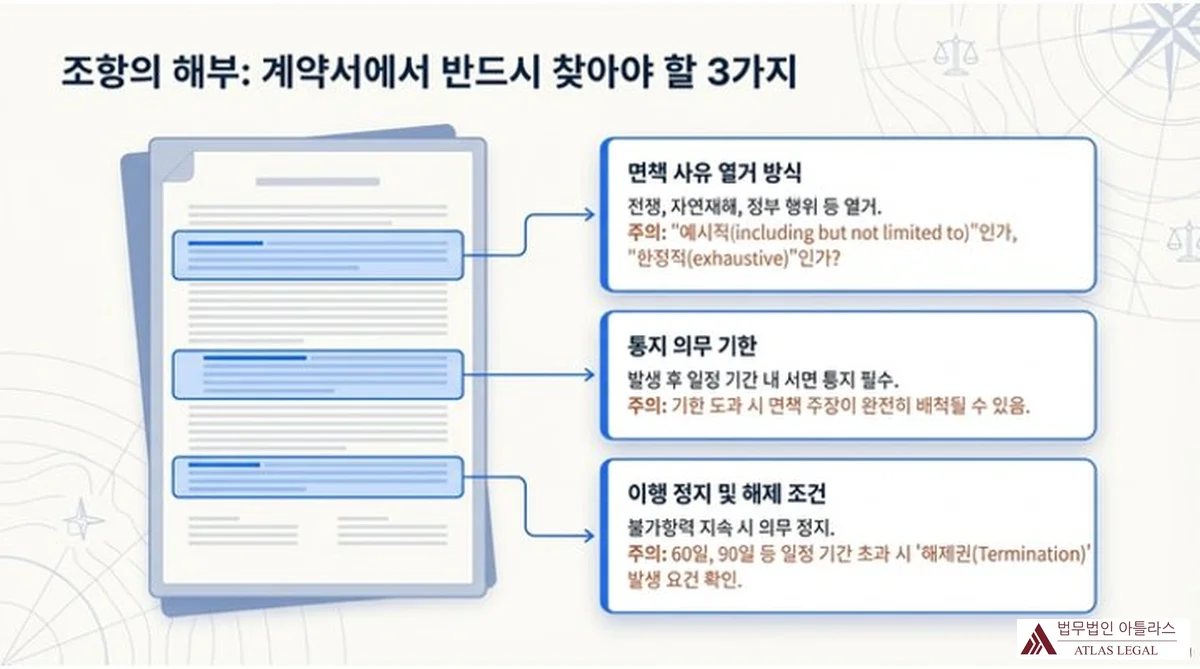 불가항력 조항에서 확인해야 할 사항은 다음과 같습니다.