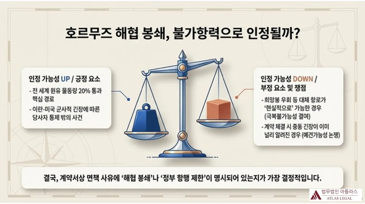 결국, 호르무즈 해협 봉쇄가 불가항력으로 인정될 수 있는지는 계약서에 기재된 불가항력 조항의 문언, 준거법, 그리고 구체적 사실관계에 따라 개별적으로 판단해야 합니다. 계약서의 면책 사유 열거 방식에 따라 인정 가능성이 크게 달라질 수 있으므로 계약서 최초 검토가 가장 중요한 단계입니다.