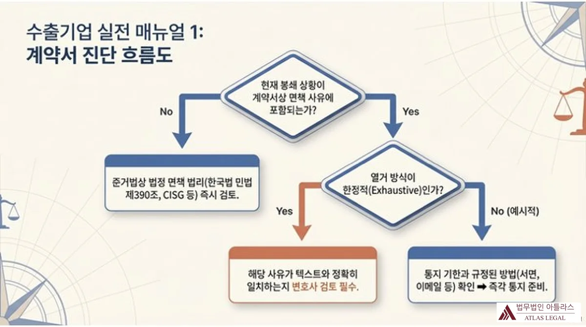 수출기업 실전 매뉴얼 1: 계약서 진단 흐름도. 다이아몬드형 판단 박스와 화살표로 구성된 플로우차트로, 현재 봉쇄 상황이 계약서상 면책 사유에 포함되는지 여부를 시작점으로, No인 경우 준거법상 법정 면책 법리(한국법 민법 제390조, CISG 등) 즉시 검토, Yes인 경우 열거 방식이 한정적(Exhaustive)인지 여부를 재판단하여, 한정적이면 해당 사유가 텍스트와 정확히 일치하는지 변호사 검토 필수, 예시적이면 통지 기한과 규정된 방법(서면, 이메일 등) 확인 후 즉각 통지 준비로 이어지는 구조