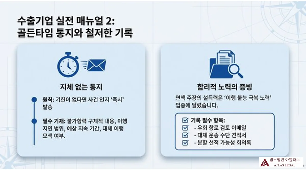 수출기업 실전 매뉴얼 2: 골든타임 통지와 철저한 기록. 두 개의 카드로 구성되며, 좌측 지체 없는 통지 카드에는 원칙(기한이 없다면 사건 인지 즉시 발송)과 필수 기재 사항(불가항력 구체적 내용, 이행 지연 범위, 예상 지속 기간, 대체 이행 모색 여부)이 나열되고, 우측 합리적 노력의 증빙 카드에는 면책 주장의 설득력은 이행 불능 극복 노력 입증에 달렸다는 설명과 함께 우회 항로 검토 이메일, 대체 운송 수단 견적서, 분할 선적 가능성 회의록 등 기록 필수 항목이 체크리스트로 표시됨