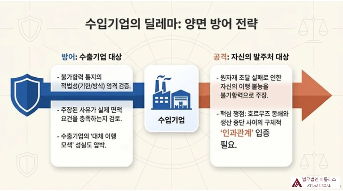 수입기업(바이어)의 입장은 이중적입니다. 상대방 수출기업의 불가항력 주장에 대응하는 동시에, 자신도 원자재 조달 차질로 인한 이행 불능을 불가항력으로 주장해야 할 수 있습니다.