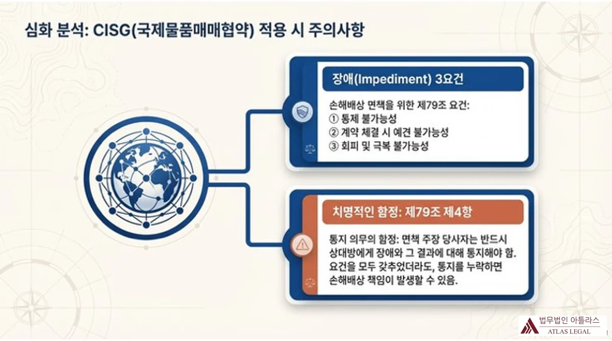 CISG 적용 계약 CISG 제79조 (통제 불가능한 장애) 면책 요건 엄격; 제79조 제4항의 통지 의무 별도 준수 필요. 우리나라는 CISG 체약국이므로, 거래 상대방의 소재지도 체약국에 있으면 CISG 제1조 제1항에 따라 한국 민법에 우선하여 CISG가 직접 적용됨