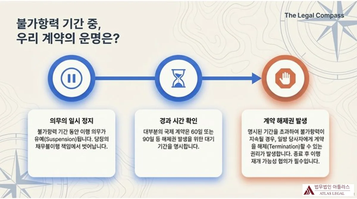 불가항력 기간 중 계약의 운명을 세 단계 타임라인으로 표현한 슬라이드. 일시 정지 아이콘부터 모래시계, 정지 표시 아이콘으로 이어지는 화살표 흐름 위에 각 단계가 설명됨. 첫째 의무의 일시 정지(불가항력 기간 동안 이행 의무가 유예Suspension되며 채무불이행 책임에서 벗어남), 둘째 경과 시간 확인(대부분의 국제 계약은 60일 또는 90일 등 해제권 발생을 위한 대기 기간을 명시), 셋째 계약 해제권 발생(명시된 기간을 초과하여 불가항력이 지속될 경우 일방 당사자에게 계약 해제Termination권이 발생하며 종료 후 이행 재개 가능성 협의가 필수)로 구성됨