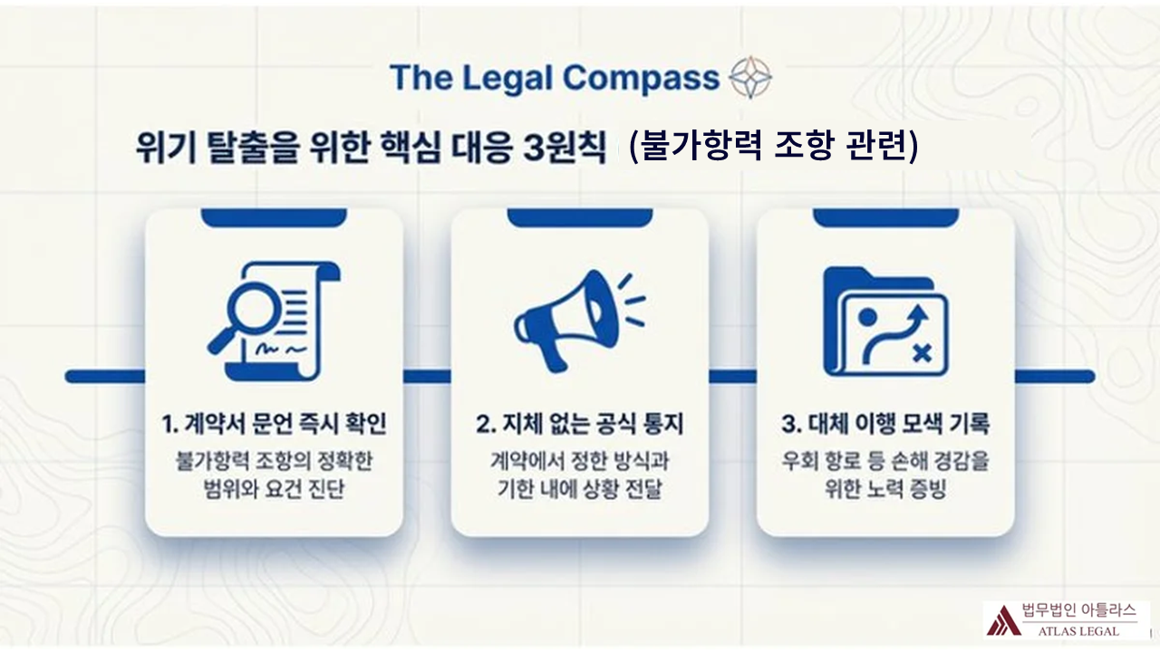 법무법인 아틀라스는 기업 자문 및 국제 계약 분쟁을 전문으로 처리하는 인천 송도 소재 로펌입니다. 국제 거래 과정에서 불가항력 분쟁이나 계약서 검토가 필요한 경우, 실무에서 다수의 국제 계약 분쟁을 처리한 경험을 토대로 계약서 문언 분석부터 통지서 작성, 중재·소송 대응까지 단계별로 지원해 드립니다.
