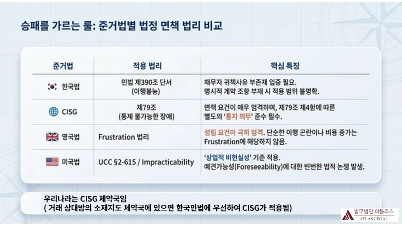 승패를 가르는 룰: 준거법별 법정 면책 법리 비교표. 한국법(민법 제390조 단서 이행불능, 채무자 귀책사유 부존재 입증 필요·명시적 계약 조항 부재 시 적용 범위 불명확), CISG(제79조 통제 불가능한 장애, 면책 요건 매우 엄격·제79조 제4항 별도의 통지 의무 준수 필수) 우리나라는 CISG 체약국이므로, 거래 상대방의 소재지도 체약국에 있으면 CISG 제1조 제1항에 따라 한국 민법에 우선하여 CISG가 직접 적용됨, 영국법(Frustration 법리, 성립 요건 극히 엄격·단순 이행 곤란이나 비용 증가는 Frustration에 해당하지 않음), 미국법(UCC §2-615 / Impracticability, 상업적 비현실성 기준 적용·예견가능성에 대한 빈번한 법적 논쟁 발생)의 네 가지 준거법이 표 형식으로 비교됨