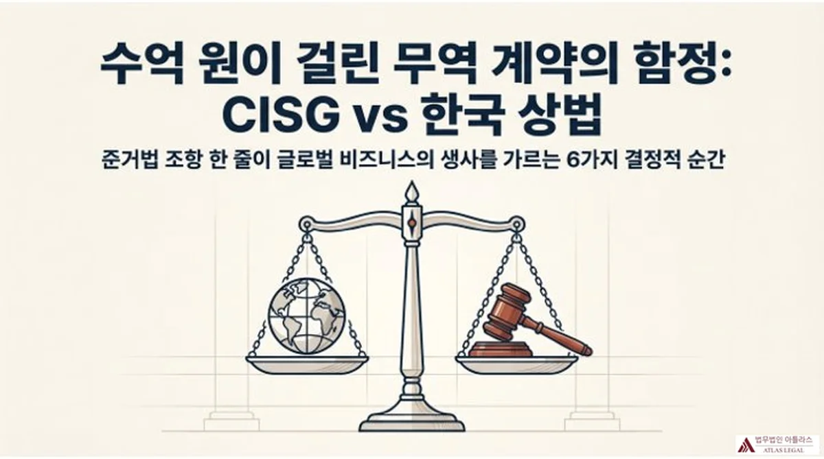 저울 한쪽에 지구본, 다른 쪽에 법원 망치를 얹어 CISG와 한국 상법의 균형을 표현한 인포그래픽. '수억 원이 걸린 무역 계약의 함정: CISG vs 한국 상법' 제목과 '준거법 조항 한 줄이 글로벌 비즈니스의 생사를 가르는 6가지 결정적 순간'이라는 부제가 표시됨