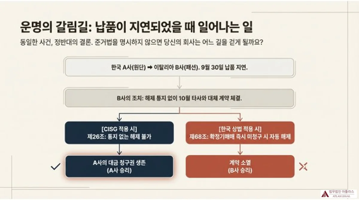 가상의 사례: 한국 섬유업체 A사가 이탈리아 패션업체 B사와 시즌 의류 원단 공급계약을 체결했습니다. 계약서에는 “9월 30일까지 납품”이라고 명시되어 있었고, A사는 납품 기한을 며칠 넘겼습니다. B사는 아무런 해제 통지도 보내지 않은 채 10월 초에 다른 업체와 대체 계약을 맺었고, 그제야 A사에게 “계약은 이미 끝났다”고 통보했습니다. A사는 “해제 통보를 받은 적이 없으니 계약은 살아 있다”며 대금을 청구했습니다. 한국 상법이 적용되면 확정기매매에서 B사가 즉시 이행을 청구하지 않았으므로 계약은 자동 해제된 것으로 봅니다(제68조). 그러나 CISG가 적용된다면 해제 통지 없이는 계약이 소멸하지 않습니다(제26조). 준거법 조항 한 줄이 수억 원 청구권의 생사를 가릅니다.
