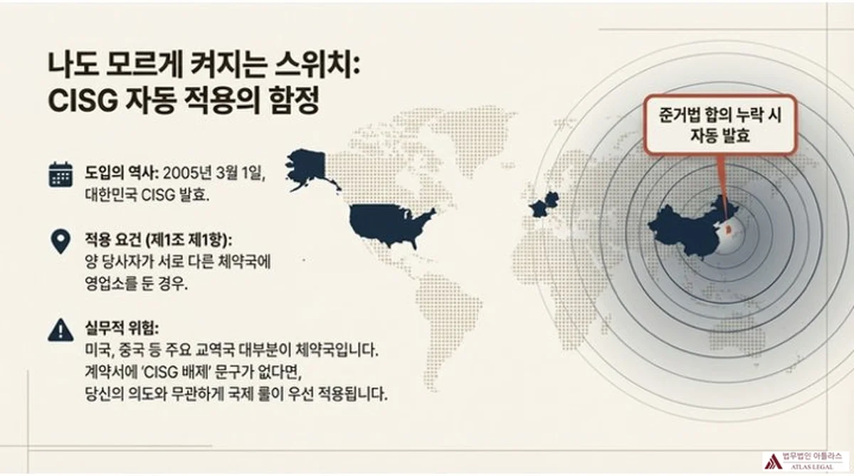 세계지도 위에 CISG 발효일(2005년 3월 1일)과 적용 요건(제1조 제1항), 미국·중국 등 주요 체약국 표시 및 '준거법 합의 누락 시 자동 발효' 경고 콜아웃이 포함된 CISG 자동 적용 위험 안내 인포그래픽