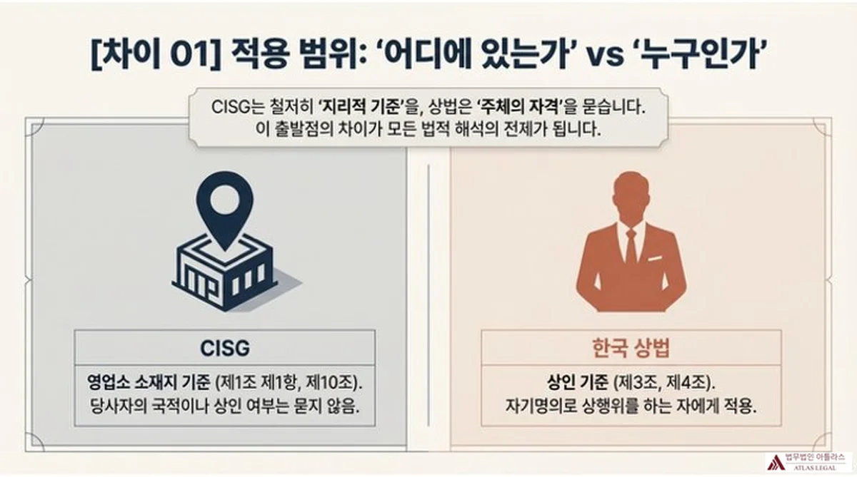 CISG는 ‘영업소의 소재지’를, 한국 상법은 ‘상인 여부’를 적용 기준으로 삼습니다. 이 출발점의 차이가 이후 모든 비교의 전제가 됩니다.