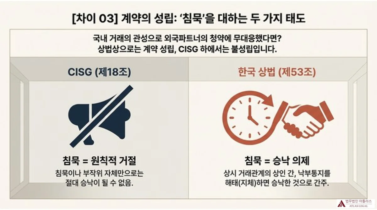 CISG와 한국 상법의 침묵에 대한 태도를 비교한 인포그래픽. 왼쪽에 소리 차단 아이콘과 'CISG 제18조: 침묵 = 원칙적 거절, 침묵·부작위 자체만으로는 절대 승낙 불가', 오른쪽에 시계와 악수 아이콘으로 '한국 상법 제53조: 침묵 = 승낙 의제, 상시 거래관계 상인 간 낙부통지 해태(지체)하면 승낙으로 간주'가 대비 표시됨