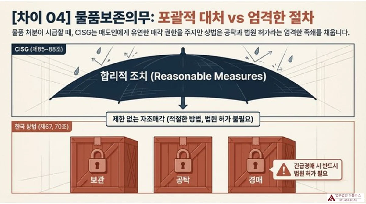 물품보존: 포괄적 합리적 조치(CISG) vs 엄격한 절차(상법)