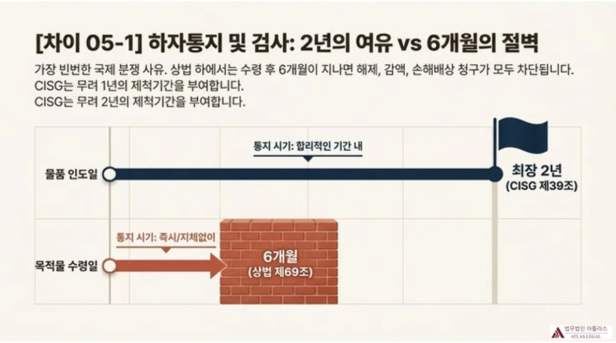 하자통지 제척기간: 최장 2년(CISG) vs 6개월(상법 제69조)