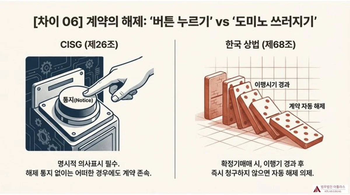 CISG와 한국 상법의 계약 해제 방식을 대비한 인포그래픽. 왼쪽에 '통지(Notice)' 버튼을 누르는 손 일러스트로 'CISG 제26조: 명시적 의사표시 필수, 해제 통지 없이는 어떠한 경우에도 계약 존속', 오른쪽에 도미노가 쓰러지는 일러스트로 '한국 상법 제68조: 이행시기 경과 후 즉시 청구하지 않으면 계약 자동 해제 의제'가 대비 표시됨