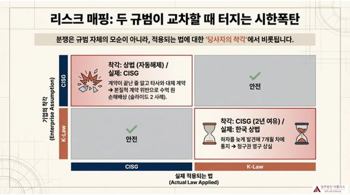 CISG와 한국 상법이 교차 적용될 때 발생하는 리스크를 4분면 매트릭스로 표현한 인포그래픽. 기업의 착각(CISG/K-Law)과 실제 적용되는 법(CISG/K-Law)의 교차점에서, 착각:상법(자동해제)/실제:CISG 시 수억 원 손해배상 위험, 착각:CISG(2년 여유)/실제:상법 시 청구권 영구 상실 위험이 표시됨