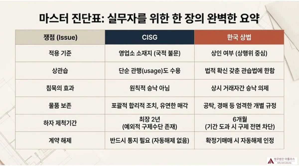 CISG와 한국 상법의 6가지 핵심 쟁점(적용 기준·상관습·침묵의 효과·물품 보존·하자 제척기간·계약 해제)을 한 표에 정리한 마스터 진단표. CISG와 한국 상법의 각 항목이 간결하게 비교 요약됨